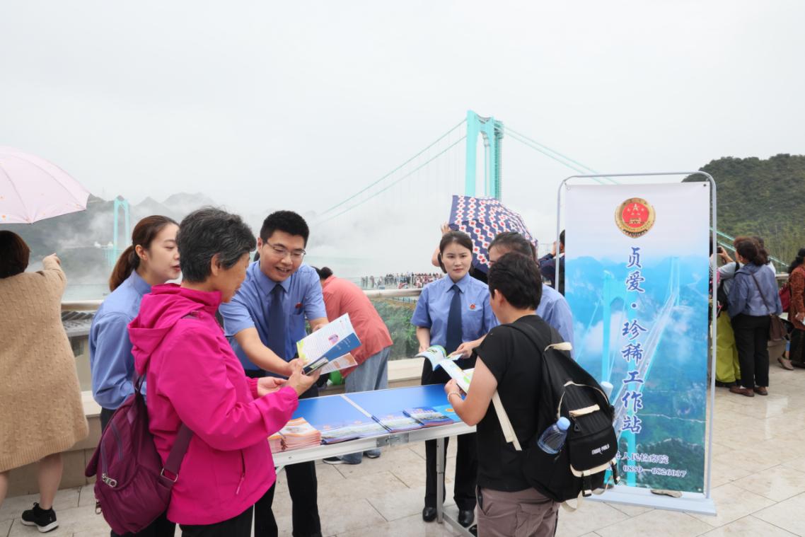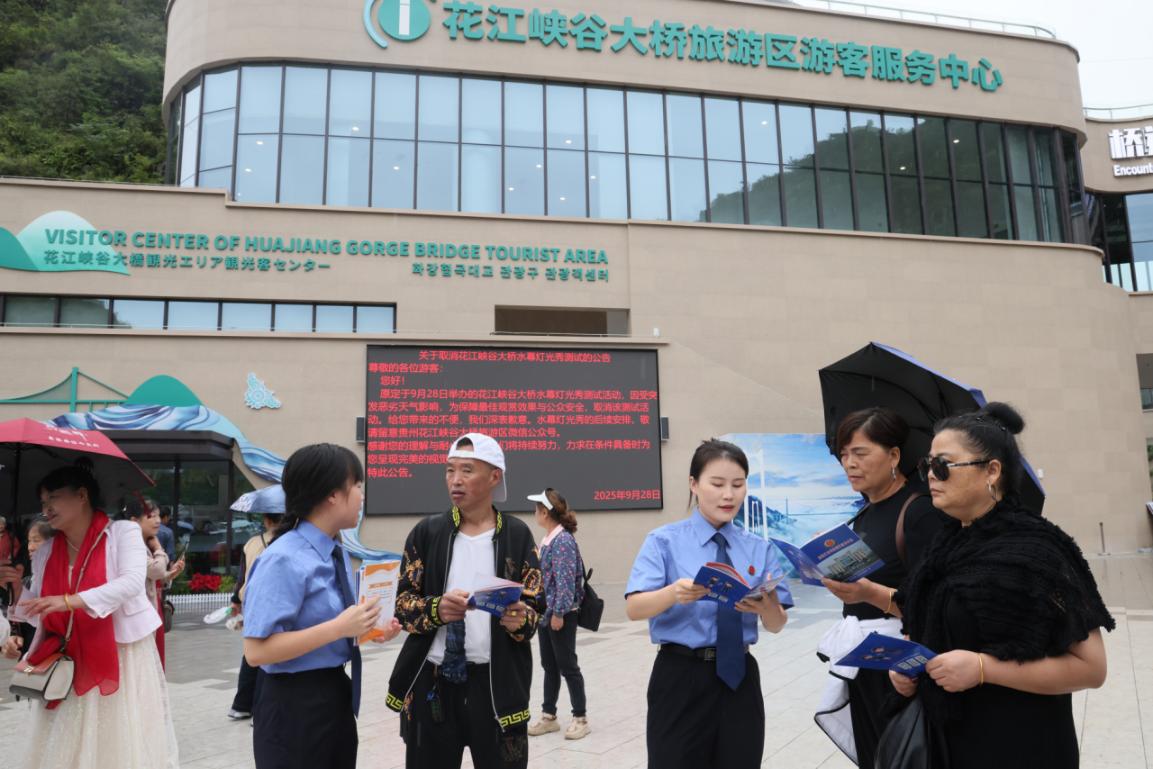 这座主跨1420米、桥面距水面625米的超级工程,通车后将迎来国庆长假。9月29日,该院检察官们来到花江峡谷大桥,为游客送上特别的“法治礼包”。检察官们通过悬挂横幅、发放普法手册、现场答疑等形式,向游客讲解旅游法、民法典等法律中与权益保障相关的条款,并提示注意高空景区安全等事项。